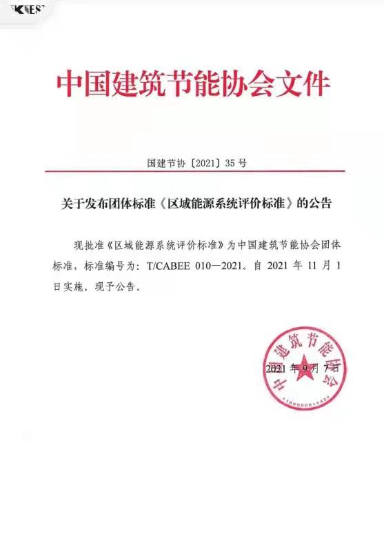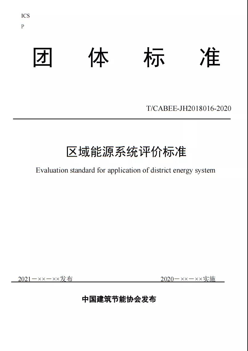 由中国建筑节能协会区域能源专业委员会组织发起,泛华建设集团有限公司和中节能建筑节能有限公司会同国家节能中心、生态环境部与经济政策研究中心、国家物品编码中心、北京绿色交易所有限公司、北京光华设计发展基金会、哈尔滨工业大学建筑学院等单位参编的《区域能源系统评价标准》,获批中国节能协会团体标准,并于2021年11月1日起实施(具体详见国建节协[2019]5号《关于印发<2019年度第一批团体标准制修订计划>的通知》)。