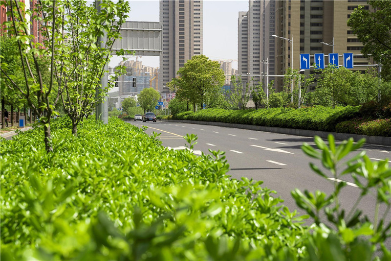 人行道选择落叶乔木栾树,以呼应周边居住区氛围,保证持续稳定的绿化界面;侧分带以“广玉兰+白玉兰”为段落特色树种,下层地被以规则的交错折线为基本造型,形成韵律变化的空间结构;中分带以红梅、香樟、乌桕为段落特色树种,下层地被以规则的交错折线为基本造型,增加紫叶美人蕉、鸢尾、大花六道木等开花品种,形成丰富的道路绿化生态轴。