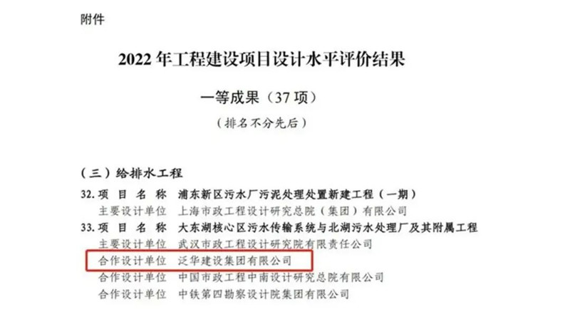 近日,泛华集团大东湖核心区污水传输系统与北湖污水处理厂及其附属工程荣获中施企协2022年工程建设项目设计水平评价一等成果奖。