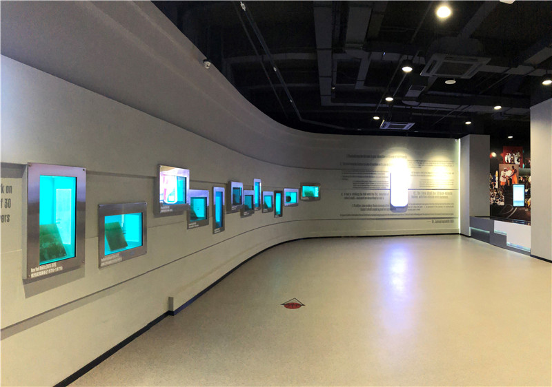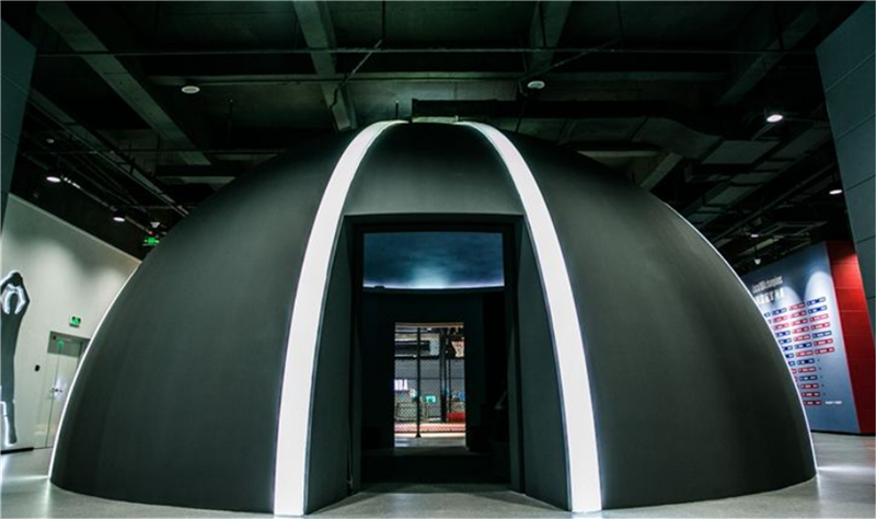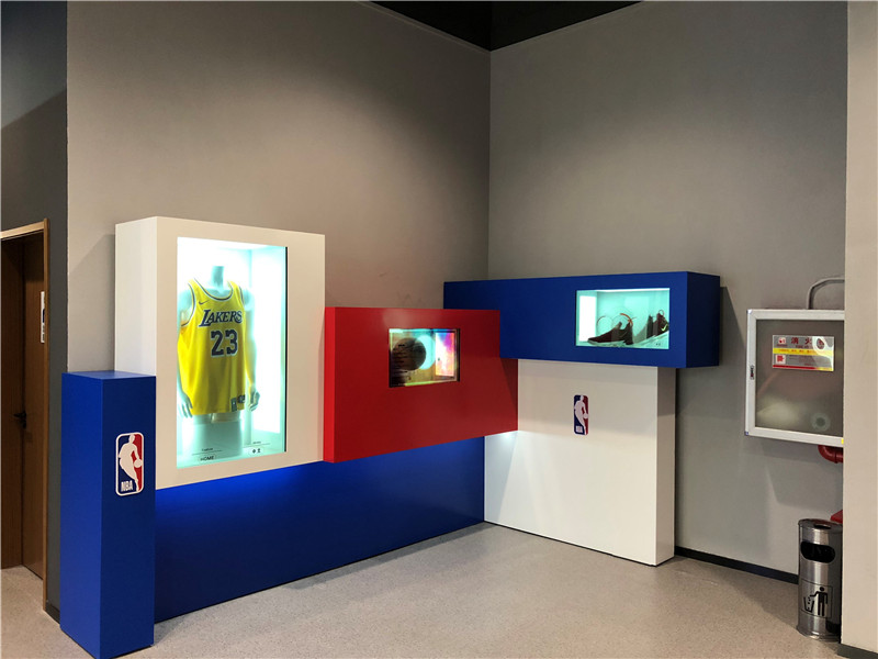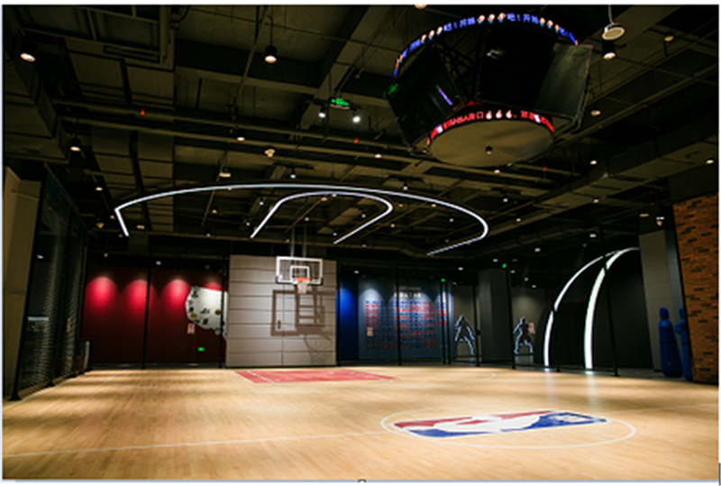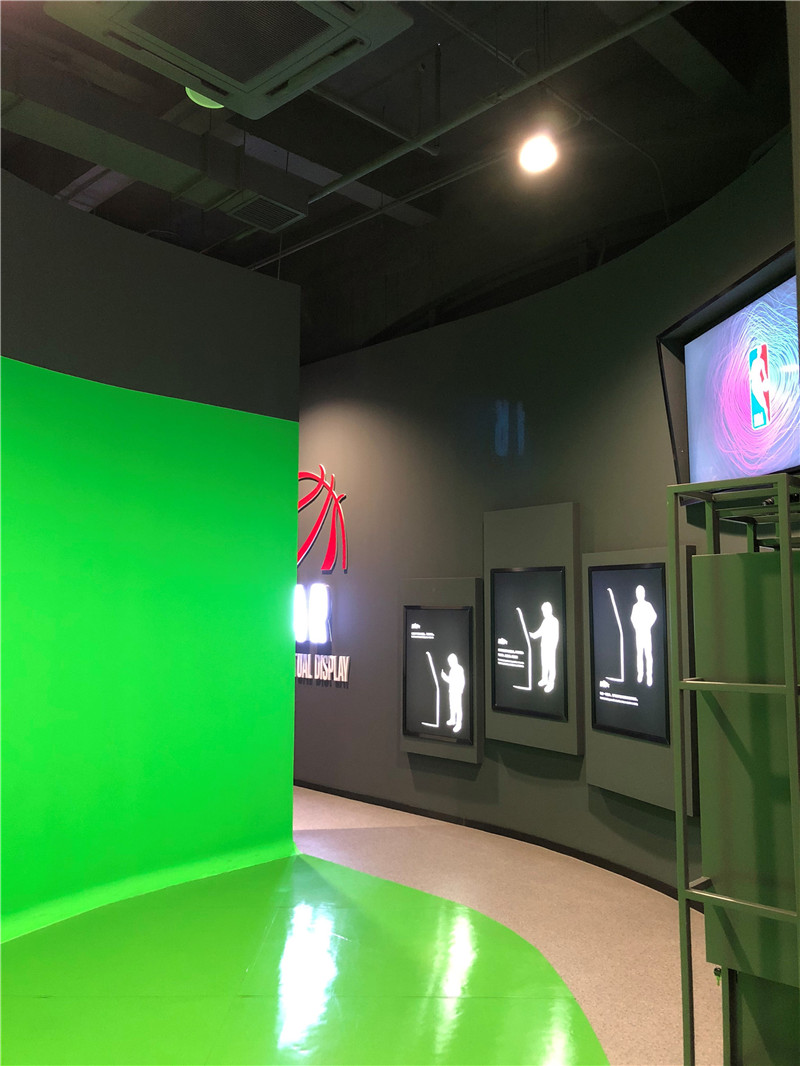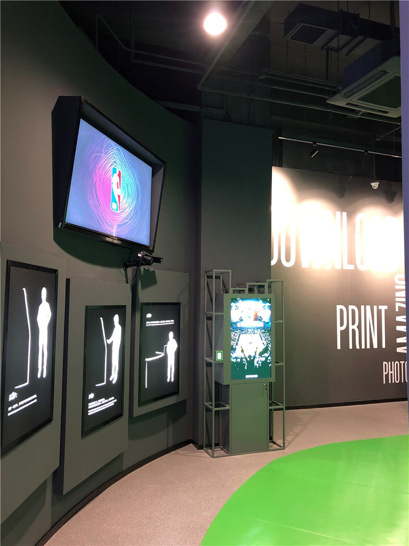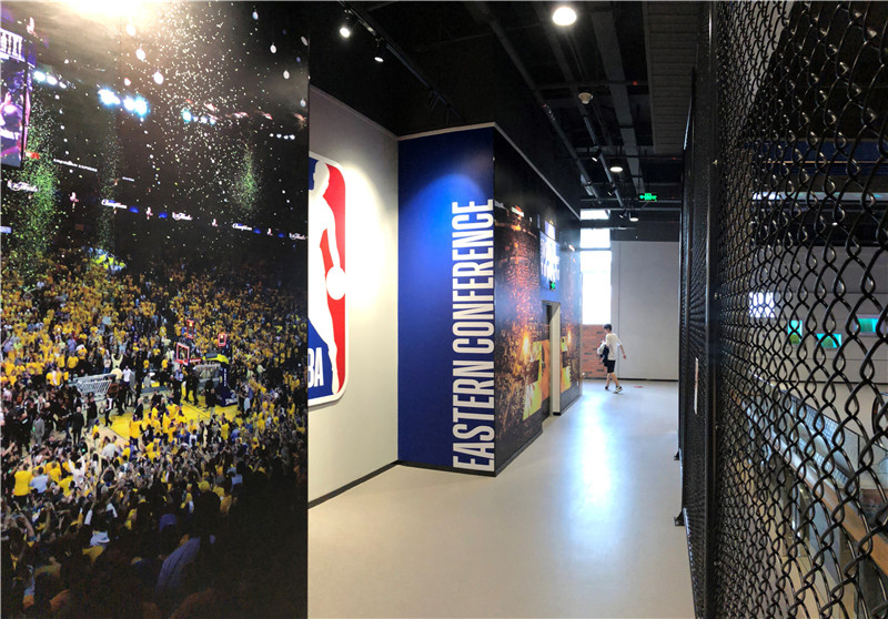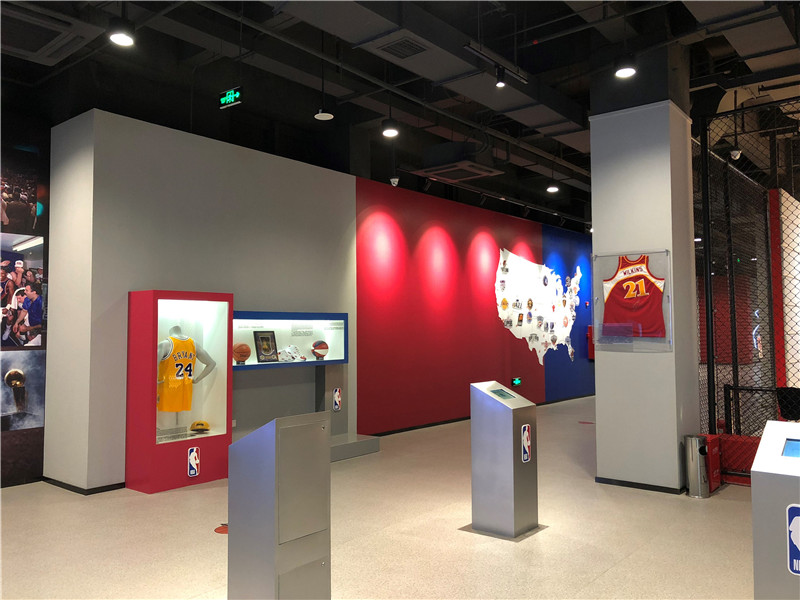 展馆主要分上下两层,第一层主要是互动体验馆入口、英雄大厅和NBA商品零售店。其中英雄大厅主要展示了NBA及WNBA的知名球员。第二层主要是展览体验区,主要版块包括历史展、篮球影院、动感篮球区、科技区和篮球场;互动体验馆历史展区使用了十二块高科技透明的屏幕,在展示真实展品的同时给球迷详细介绍了展品的来源,特色及历史意义,通过交互式的展览形式,粉丝们可以更真实的了解展品和NBA的历史文化。动感篮球区是NBA专利游戏项目,通过游戏互动在玩的过程中爱上篮球,让大家更喜欢这项运动。在互动体验馆的科技区,球迷粉丝们可以感受VR, AR虚拟与现实的体验,更可以在绿屏拍照区把在NBA各个球队主场的留影。