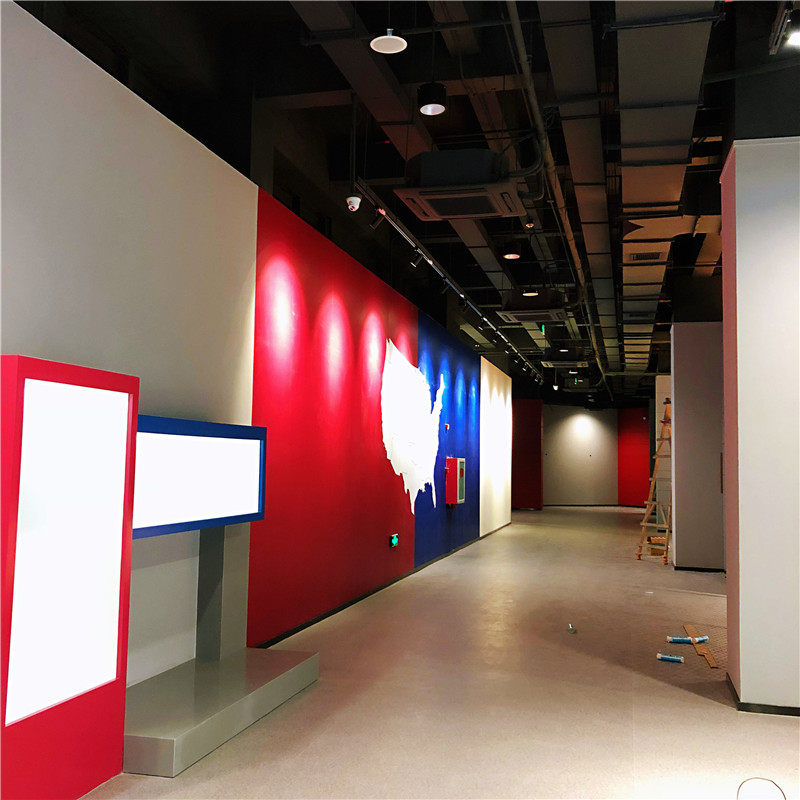 展馆的装饰设计中,运用了新颖时尚、现代的设计风格,通过色彩的主导和灯光的配合,加之新型材料的运用,充分表现出NBA文化的魅力所在;在项目施工中,我们通过严格的管理手段,从项目策划阶段就介入整体项目的设计方案,通过我们的施工经验对整个项目的材料、工期、安全、环保等方面提前进行项目评估,特别是在施工过程中,项目团队通过相互配合、积极沟通,在施工管理的细节上更是精益求精,除了严格执行国家相关施工规范及验收标准,还通过与各方的紧密配合,对新型环保材料的使用也推陈出新。施工采用了涂腻的工艺取代了传统的墙面腻子施工工艺,这种涂腻工艺材料配方厂家已经申请了国家专利,尤其是在海南高温高湿的气候条件下,不脱落、不霉变,施工过程中没有灰尘产生,后期无需使用砂纸打磨,一次到位,是一种很好的基层材料,表面既可涂刷任何品牌的水性涂料、油漆,又可以直接粘贴墙纸、壁布等饰面材料,基底坚固无空鼓脱落现象,在造价方面仅有传统基底腻子的三分之二,特别适合大面积集中施工,这种材料工艺适合在今后的项目中推广使用。