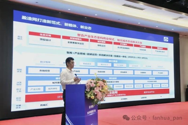 泛华集团副总裁、育城汇公司总经理雷超兵系统阐述了集团以数字经济为引擎、特色产业为抓手的育城发展战略。他指出,产业育城的核心方法论是围绕地方特色单品,导入数字经济、科技创新等要素,构建"一品一网一平台一中心多基地"的数实融合体系,通过盘活存量园区、打造交易中心,形成税收增长与城镇化升级的良性循环。通过"投融资驱动"与"智库引领"双轮驱动,联动能碳平台、盈造网等平台资源,以"联合经营、项目合作、属地深耕"机制,共同推进产业育城中心建设与园区运营。