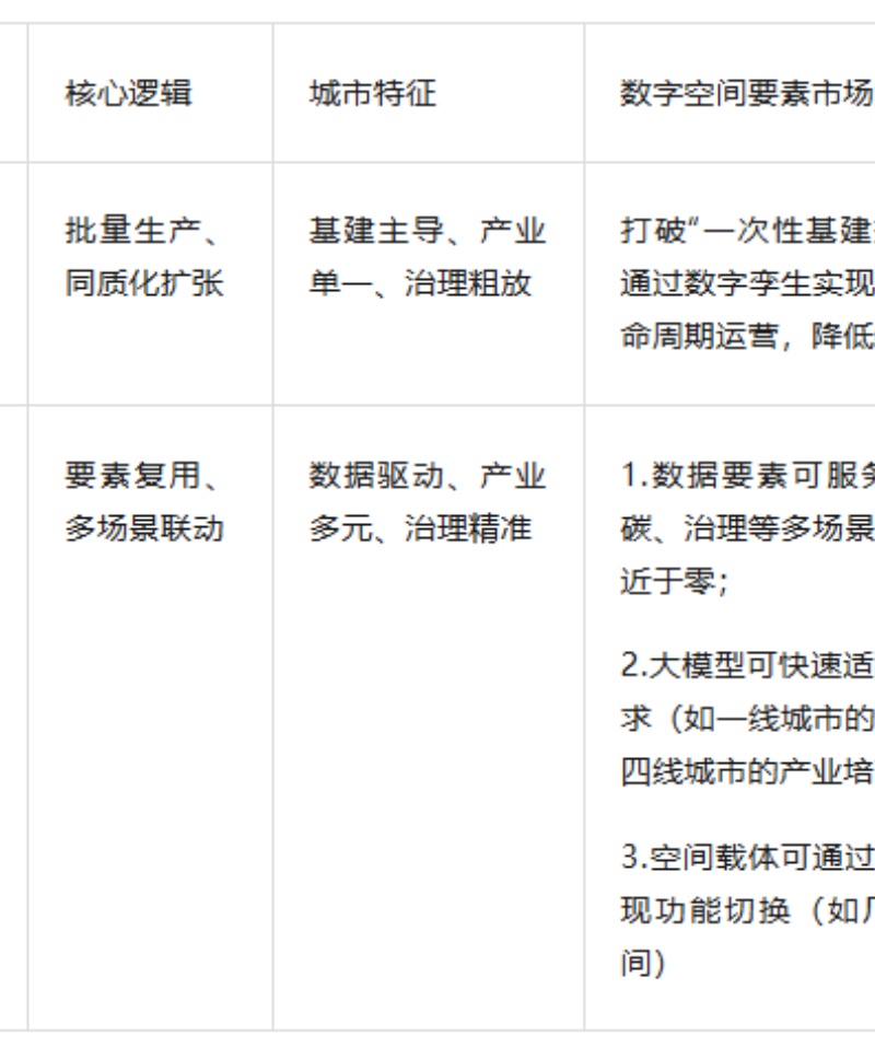 城市发展范式的迭代,本质是“要素利用效率”的升级。工业经济时代,城市依托“规模经济”实现增长——向内部要素要效益,以自身要素的规模经济为核心,依靠资源禀赋,并通过批量建设基础设施、同质化发展产业,降低单位成本;而数字经济时代,城市建设数字空间要素市场推动发展范式转向“范围经济”—— 跨越空间连接,通过数字经济连接创新要素,连接产业生态;产业跨界融合,基于要素的动态变化,通过范围共享,实现产业跨界融合,通过数据要素的“复用性、联动性”,实现“一类要素、多场景赋能”,大幅提升要素利用效率。