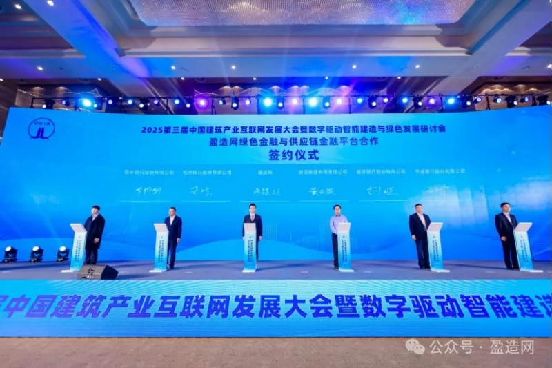 为助力建筑业低碳转型,大会还举办了“盈造网绿色金融与供应链金融平台签约仪式”。中国建设银行、中国民生银行、华夏银行、兴业银行、上海浦发银行、建信融通、杭州银行、盛京银行、恒丰银行、宁波银行等十家金融机构共同签署合作协议,各方将围绕供应链金融、能碳金融、绿色融资等领域深化合作,构建以产业互联网为支撑的绿色金融与产融协同体系。此举将为建筑产业注入更强绿色动能,推动更多低碳项目落地,助力“双碳”目标实现。