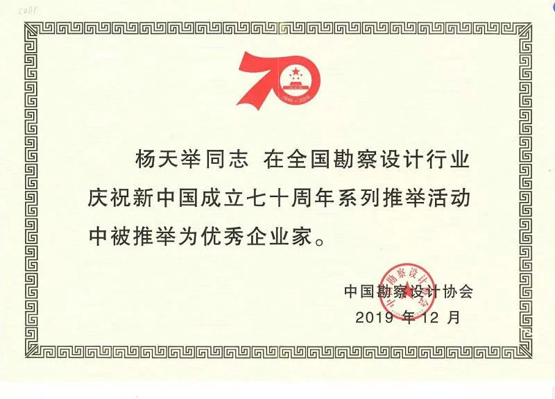 为了庆祝中华人民共和国成立70周年,展示新中国成立70年来全国勘察设计行业为国家经济和社会发展作出的巨大贡献以及行业取得的辉煌成就,12月11日,全国勘察设计同业协会共庆新中国成立70周年大会暨中国勘察设计协会六届二次会员代表大会在广州隆重召开。大会发布了全国勘察设计行业新中国成立70年系列推举榜单,泛华集团董事长杨天举被推举为“优秀企业家”。