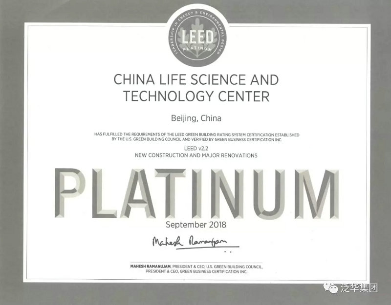 泛华集团承接的项目管理项目中国人寿研发中心工程B座(数据中心),获得美国绿色建筑协会LEED认证最高奖项“绿色建筑铂金”认证。LEED认证自2003年建立并开始推行,是目前国际上最具权威性和影响力的绿色建筑认证体系。