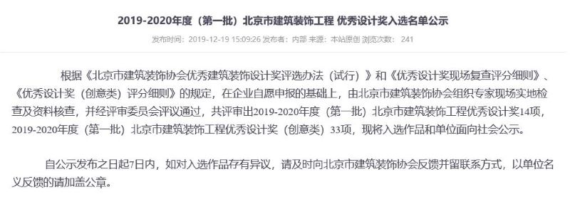 2019-2020年度(第一批)北京市建筑装饰工程优秀设计奖是根据《北京市建筑装饰协会优秀建筑装饰设计奖评选办法(试行)》和《优秀设计奖现场复查评分细则》、《优秀设计奖(创意类)评分细则》的规定,在企业自愿申报的基础上,由北京市建筑装饰协会组织专家现场实地检查及资料核查,并经评审委员会评议通过后评审出的,2019-2020年度(第一批)北京市建筑装饰工程优秀设计奖14项,2019-2020年度(第一批)北京市建筑装饰工程优秀设计奖(创意类)33项。