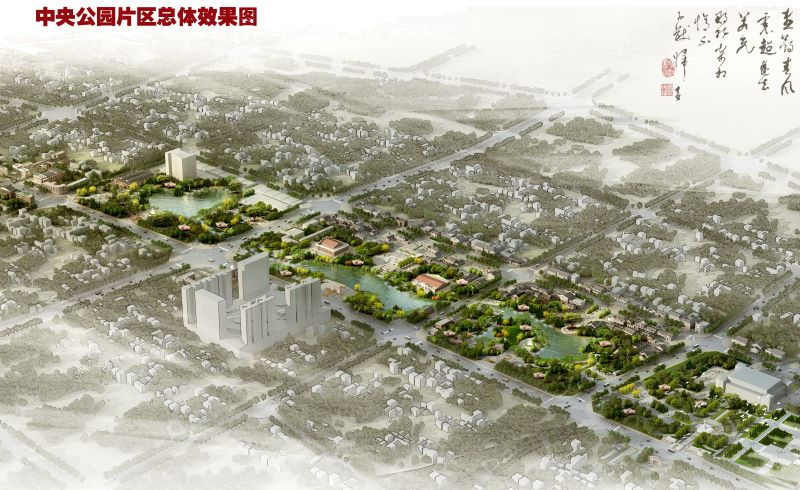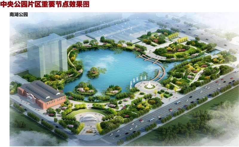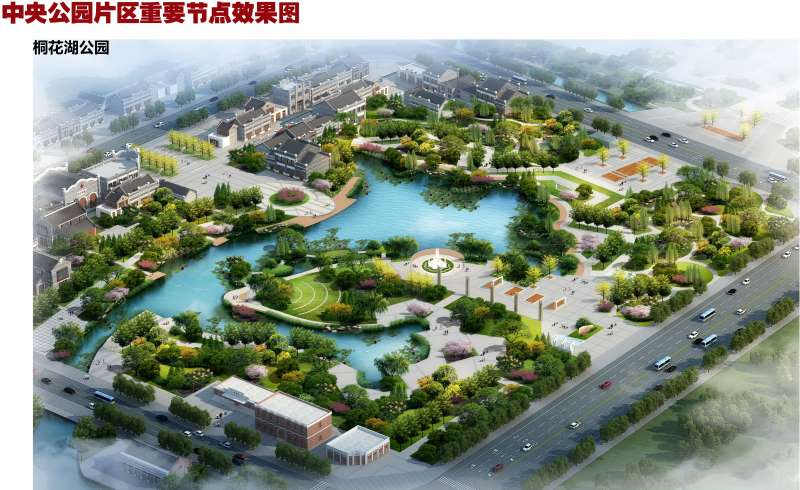 在水系梳理连通上,项目连通焦裕禄纪念园南侧的河道水系和现有南湖,并对穿过的两个街区的水系进行修整,形成具有兰考地域文化的桐花湖和抚琴湖两个新增湖面。通过湖岸沿线景观游览路线的组织,营造滨水休闲广场、滨水文化建筑以及木栈码头等亲水活动场地。