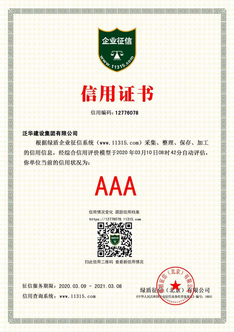泛华集团一直特别重视企业的信用体系建设,将诚信作为企业经营发展的软实力,不断完善经营活动中的信用制度,规范契约行为,抵制形形色色的损害社会利益、扰乱市场秩序的不讲信用乃至违法行为;坚持践行"为城市创造价值,为客户提升品牌"的宗旨,严格把控生产质量,不断提高服务质量,拥有咨询、勘察、设计、监理、施工五大类共计33项最高等级的资质和资信;获得住建部、科技部联合颁发的智慧城市全要素聚集试点企业;荣获商务部核准的AAA级行业信用企业资质、全国建筑业AAA级信用企业、全国典型诚信企业、中国建设银行授予信用最高等级 AAA级资信、北京市纳税信用 A 级企业称号、新中国成立60 周年百项经典暨精品工程先进企业等荣誉。