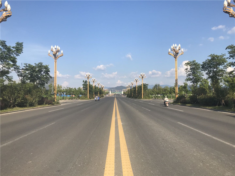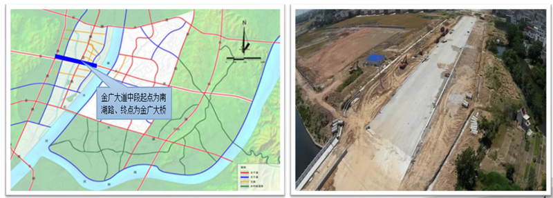 麻城市金广大道为城市主干道1.357KM, 道路横断面(14.5m绿化带+3.5m人行道+6m非机动车道+5m机非分隔带+11m机动车道)×2,道路结构层自下向上为30cm山皮石垫层、36cm水泥稳定碎石基层、16cm沥青混凝土面层;朝圣路延伸段为城市次干道1.159KM,道路横断面(3.5m人行道+4.5m非机动车道+2m机非分隔带+7.5m机动车道)×2,道路结构层自下向上为30cm山皮石垫层、36cm水泥稳定碎石基层、11cm沥青混凝土面层; 包含雨水、电力、电信工程。